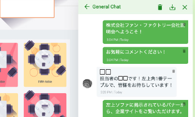会場全体・テーブル内・参加者同士など、コミュニケーションに応じてチャット交流の使い分けができます。