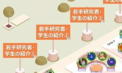 - 参加者が自由に回遊する会場型オンラインサービスは、ポスターセッションなどの展示運営に最適です。興味のあるテーブルを自由に巡り、発表を聞いたり質問をしたり、対面と遜色ないコミュニケーションがオンラインで実現します。
