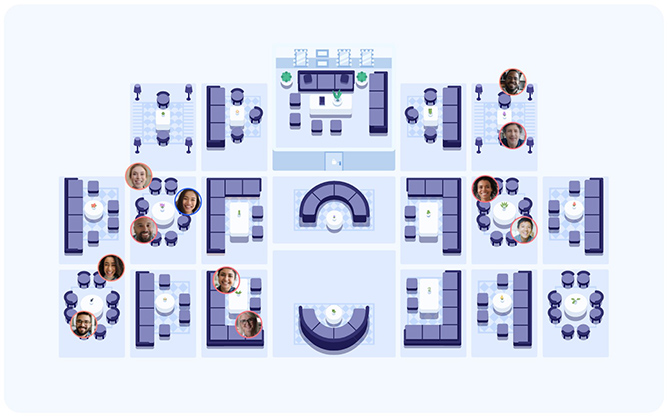 テーブル内の参加者同士でビデオ通話が可能。シェアスクリーンやホワイトボード機能も利用できます。別のテーブルをダブルクリックすれば簡単に移動ができます。